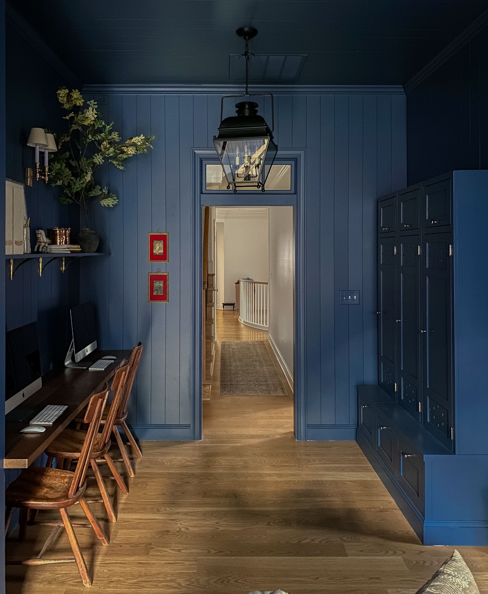 Add color and drama to any room by painting walls and trim the same for a monochromatic, yet elevated look. We love this rich, yet warm navy blue from Farrow and Ball “Stiffkey Blue” and love how blogger Chris Loves Julia styled it in their bonus room.